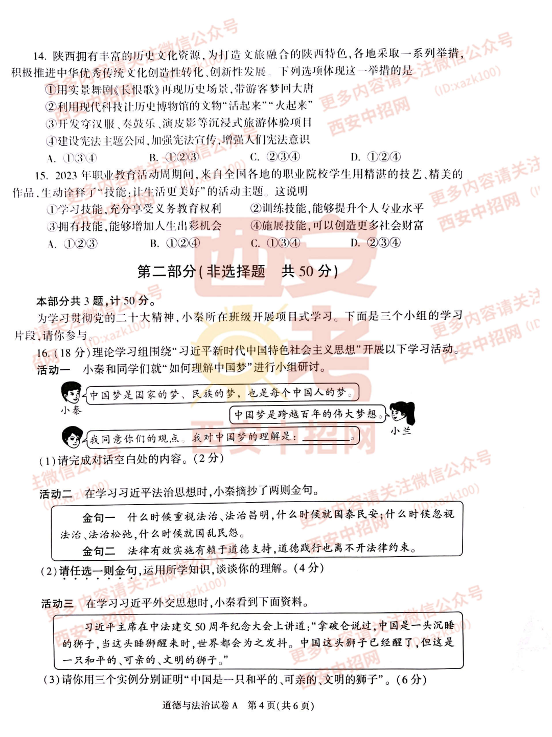 2023年陕西中考道德与法治真题及答案(转自陕西中招网)